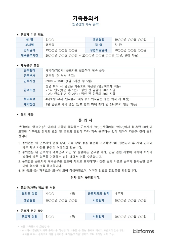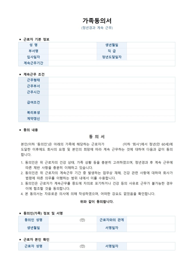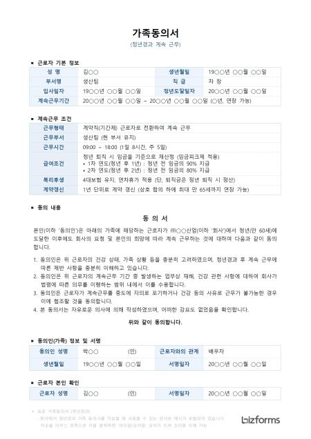 표준 가족동의서 (정년경과) 서식입니다. 가족동의서는 정년을 경과한 근로자가 회사와 합의된 연장 근무를 시행함에 있어 가족이 이에 동의한 사실을 확인하기 위해 작성하는 공식 문서입니다. 이 동의서에는 근로자와 가족 구성원의 인적 사항, 연장 근무에 대한 이해와 동의 내용, 그리고 작성 일자와 서명이 포함되어 가족과 회사 모두의 법적 안전망을 확보하는 데 중요한 역할을 합니다. 특히 정년 이후 근로자의 건강과 근무 환경에 관한 가족의 동의는 근로자의 권익과 회사의 책임소재를 명확히 하는 데 필수적입니다. 따라서 동의서는 명료하고 신뢰성 있게 작성되어야 하며, 관련 법규와 회사 정책에 부합하도록 관리되어야 합니다.