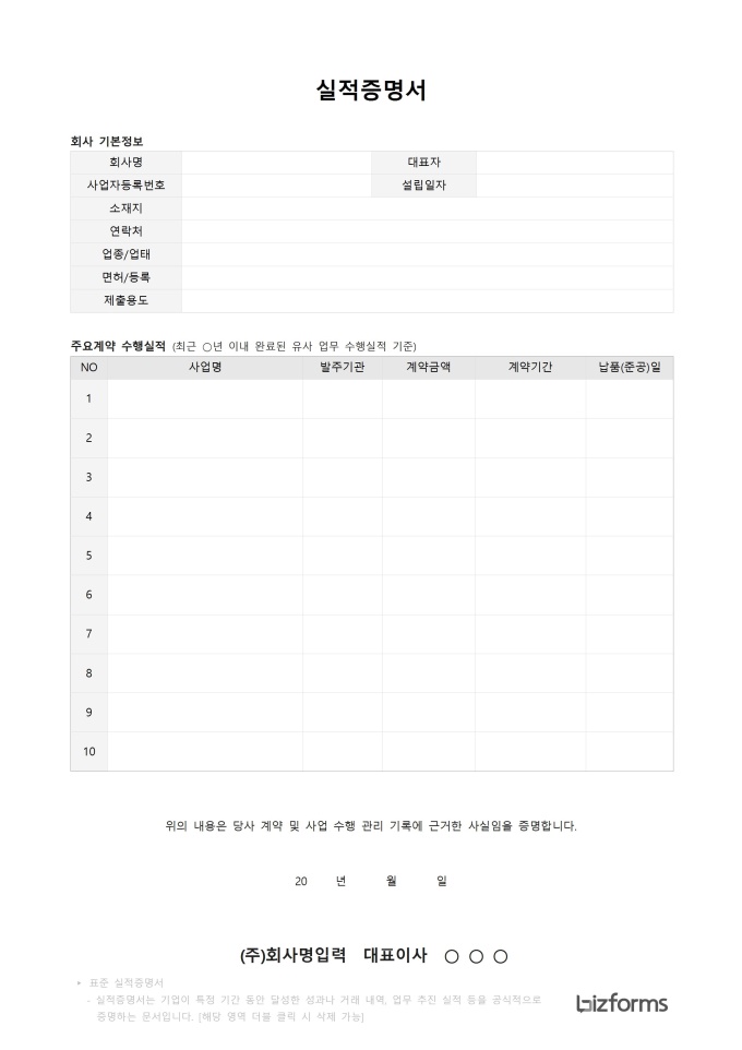 특히 중소기업과 스타트업은 사업 성장과 신뢰 구축을 위해 체계적인 실적 관리와 명확한 증명이 매우 중요하므로, 실적증명서를 꼼꼼하고 정확하게 작성하여 제출하는 것이 좋습니다.