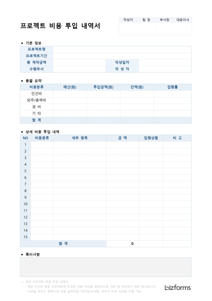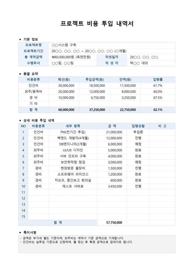 프로젝트 비용 투입 내역서는 특정 프로젝트를 수행하는 과정에서 발생한 모든 비용을 항목별로 기록하고 예산 대비 실제 집행 현황을 체계적으로 관리하는 문서입니다. 인건비, 외주비, 재료비 등 프로젝트와 관련된 모든 비용을 한 문서에서 통합 관리함으로써 프로젝트의 수익성을 실시간으로 파악하고 예산 초과를 사전에 방지하는 도구입니다.