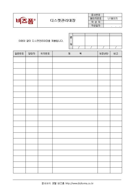 디스켓을 기록/관리할 수 있는 디스켓관리대장입니다. 일련번호, 담당자, 위치번호, 제목 등의 항목으로 구성되어있으며 담당자가 기록/관리합니다.