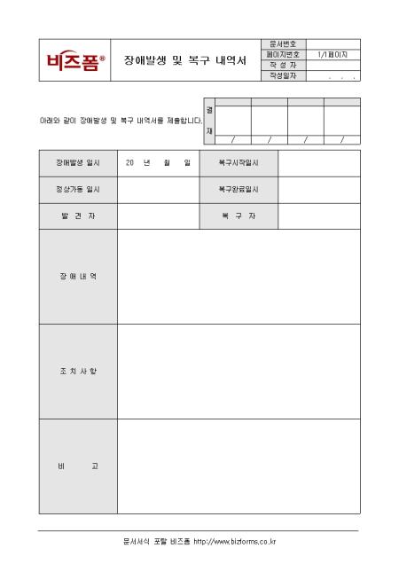 시스템 장애발생 및 복구에 관한 사항을 기록/보고하는 장애발생및복구내역서입니다. 장애발생일시, 정상가동일시, 발견자, 조치사항 등의 항목으로 구성되어있습니다. 복구자가 작성/보고합니다.