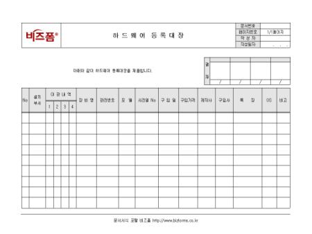 하드웨어 등록에 관한 사항을 기록/관리하는 하드웨어등록대장입니다. 설치부서, 이관내역, 장비명, 관리번호 등의 항목으로 구성되어있으며 관리담당자가 작성합니다.