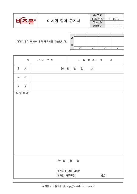 이사회 결과 통지 시 사용하는 이사회 결과 통지서입니다. 일시, 수신, 제목, 의결결과 등의 항목으로 구성되어있으며 담당자가 작성합니다.