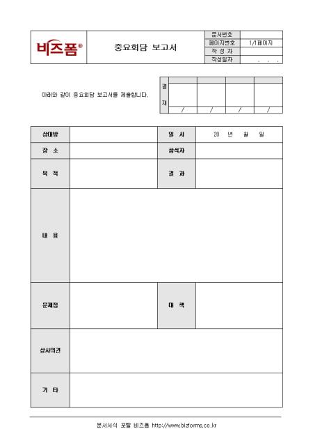 중요회담 내용을 기록/보고할 때 사용하는 중요회담 보고서입니다. 상대방, 장소, 목적, 일시, 참석자, 결과, 내용 등의 항목으로 구성되어있습니다.