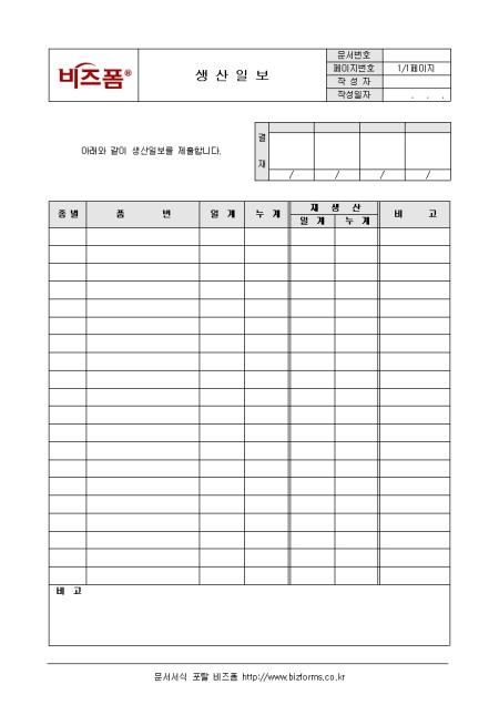 일일생산현황을 기입할 수 있는 생산일보 양식입니다. 종별, 품번, 일계 등의 항목으로 구성되어 있으며, 재생산의 생산량도 함께 기입합니다.