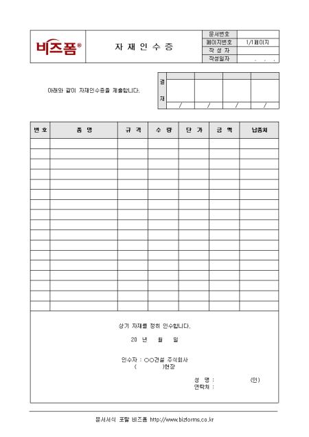 자재관리시 사용하는 자재인수증양식으로, 번호, 품명, 규격, 수량 등의 항목으로 구성되어 있습니다. 서류 작성시 인수자의 인적사항을 명확하게 기입합니다.