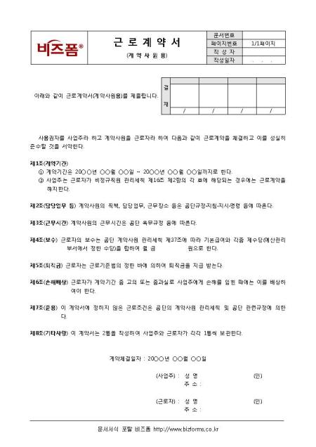 계약직근로자가 근로계약을 체결할 때 작성하는 근로계약서입니다. 8개조항으로 구성되어있으며 채용된 계약사원은 근로계약서를 작성 제출합니다.