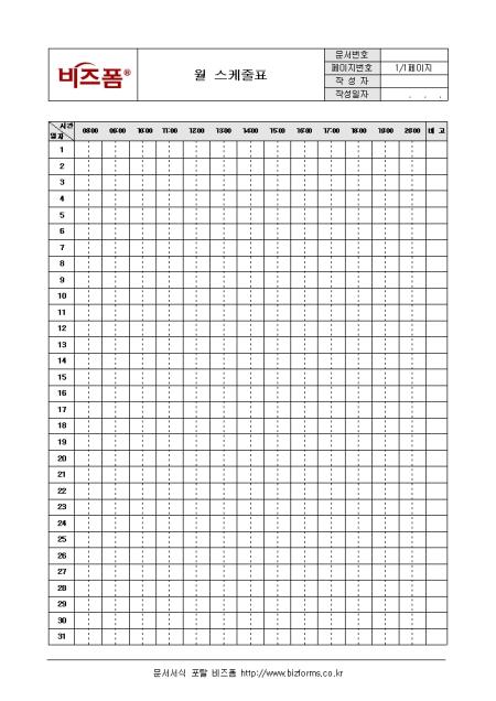 한달동안의 스케줄을 시간별로 기록할 수 있는 양식입니다. 오전 8시부터 오후 8시까지 1시간단위로 구분되어 있어 그달의 업무 진행도를 한눈에 파악할 수 있습니다.