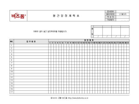 한달동안의 업무일정을 일별로 체크할 수 있는 월간 일정계획표양식입니다. 업무내용 및 일정계획을 위한 31일까지의 날짜항목으로 구성되어 있으며, 업무에 따른 진행계획기간을 체크하여 제출합니다.