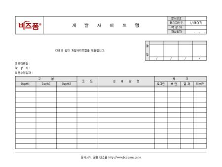 개발 프로젝트에 관한 사이트맵을 기록/관리할 수 있는 개발사이트맵 양식입니다. 구분, 코드, 상세설명, 체크 등의 항목으로 구성되어있습니다.