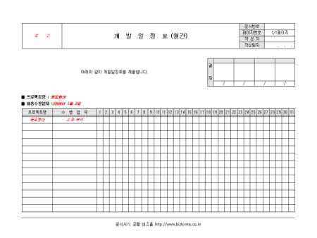 월간 프로젝트에 관한 개발 일정을 기록/ 관리할 수 있는 개발일정표 양식입니다. 프로젝트명, 수행업무, 날짜 등의 항목으로 구성되어있습니다.