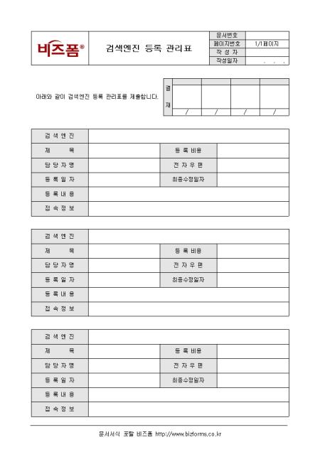 검색엔진별로 등록 내용을 기록/ 관리할 수 있는 검색엔진등록관리표 양식입니다. 검색엔진, 제목, 담당자명, 등록비용, 등록내용 등의 항목으로 구성되어있습니다.