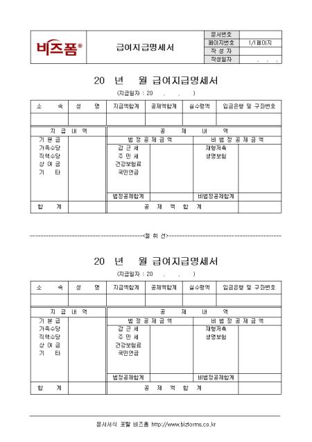 급여지급에 관한 내역을 기록하는 급여지급명세서입니다. 소속, 성명, 지급액합계, 실수령액, 지급내역 등의 항목으로 구성되어있으며 급여는 급여지급명세서를 첨부하여 전액 현금 또는 예금으로 본인에게 지급합니다.