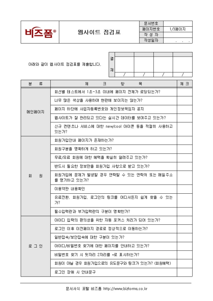 9,000원/월웹사이트 점검 시 필요한 사항을 정리해 놓은 웹사이트 점검표입니다. 분류, 체크항목, 체크 등의 항목으로 구성되어있습니다.