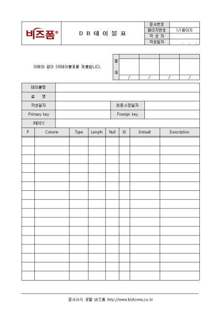 DB테이블과 관련된 사항을 기록/ 관리할 때 사용하는 DB테이블표입니다. 테이블명, 설명, 작성일자, 최종수정일자 등의 항목으로 구성되어있습니다.