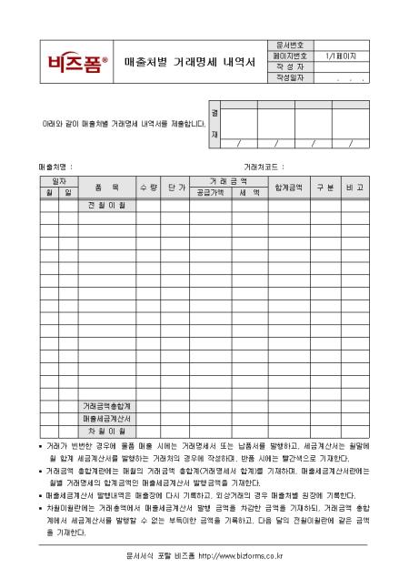 매출처별로 거래명세 내역을 기록/ 관리할 수 있는 매출처별 거래명세 내역서입니다. 매출처명, 거래처코드, 일자, 품목, 거래금액 등의 항목으로 구성되어 있으며 반품 시에는 빨간색으로 작성합니다.