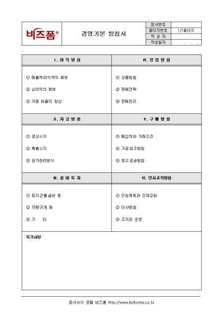 경영과 관련된 기본적인 방침을 기록해 놓은 경영기본 방침서입니다. 이익방침, 영업방침, 자금방침, 구매방침 등의 항목으로 구성되어있습니다.