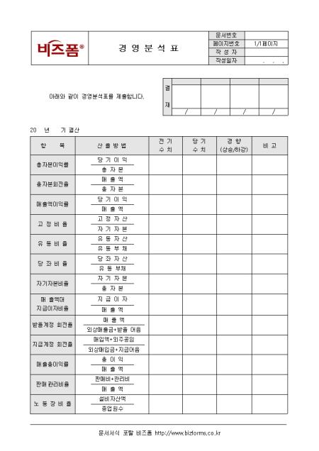 경영에 관한 사항을 분석할 때 사용하는 경영분석표입니다. 항목, 산출방법, 전기수치, 당기수치, 경향, 비고 등의 항목으로 구성되어있으며, 경영 담당자가 작성합니다.