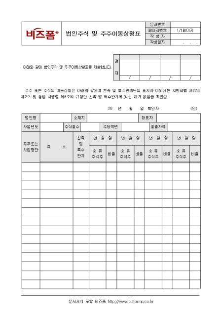 법인주식 및 주주의 이동상황을 기록할 때 사용하는 법인주식 및 주주이동상황표입니다. 주주 또는 사업명단, 주소, 친족 및 특수관계 등의 항목으로 구성되어있습니다.