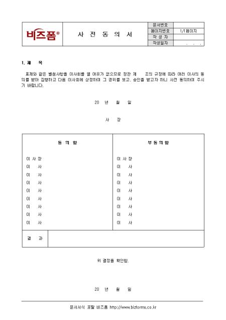 이사회 개최가 불필요 할 경우 그 내용을 기록하고 이사회에 동의를 얻고자 할 때 사용하는 사전 동의서입니다. 동의 인원과 부동의 인원의 인원의 서명을 필히 받아야합니다.