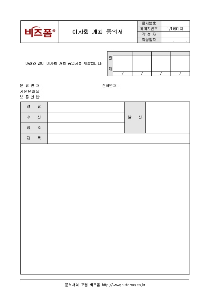 9,000원/월이사회 개최를 하고자 할 때 사용하는 이사회 개최 품의서입니다. 경유, 수신, 참조, 제목, 발신 등의 항목으로 구성되어있으며, 해당 내용을 상세히 기록합니다.