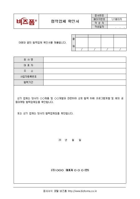 협력업체임을 확인/ 증명할 때 사용하는 협력업체 확인서입니다. 회사명, 대표자, 주소, 사업자등록번호, 협력기간 등의 항목으로 구성되어있으며 대표자가 직접 날인합니다.