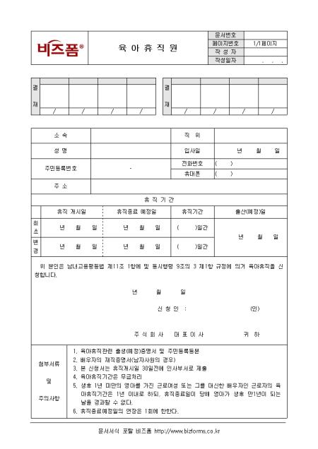 육아 휴직신청시 사용하는 육아휴직원입니다. 인적사항 및 휴직기간 등의 항목으로 구성되어 있으며, 첨부서류와 함께 제출합니다.