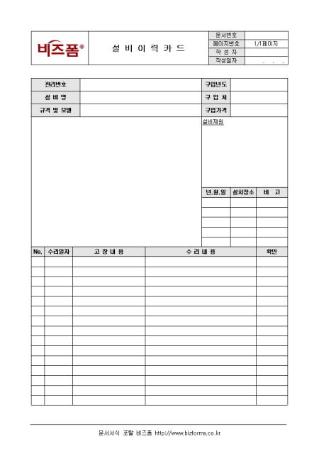 효율적인 설비관리를 위해 필요한 설비이력카드 양식입니다. 관리번호, 구입년도, 수리일자, 고장내용 등의 항목으로 구성되어 있습니다.