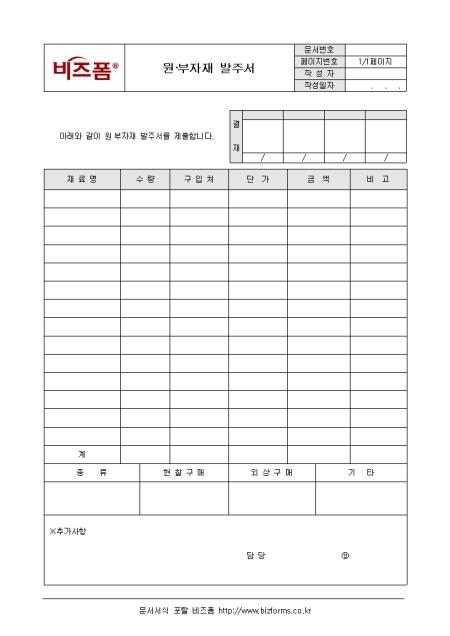 원료, 부자재 재고 관리시 사용하는 원•부자재발주서 입니다. 재료명, 수량, 구입처, 단가, 금액 등의 항목으로 구성되어 있으며, 구매형태를 구분하여 작성합니다.