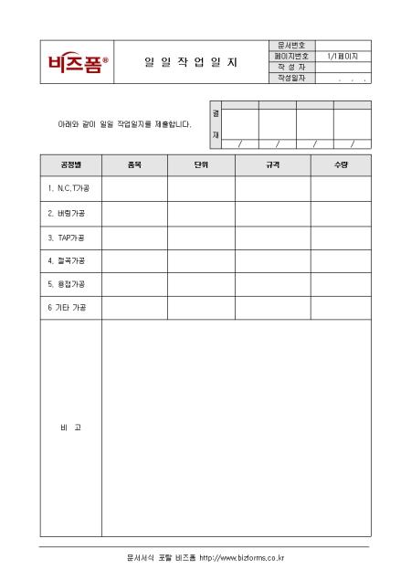 N.C.T가공, 버링가공, TAP가공,절곡가공 등의 공정별 일일작업일지 양식입니다. 품목, 단위, 규격, 수량 등의 항목으로 구성되어 있습니다.