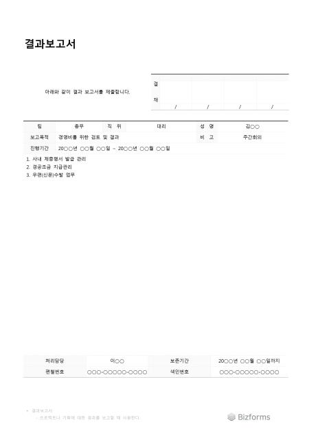 프로젝트나 기획에 대한 결과를 보고할때 사용하는 결과 보고서 양식입니다. 보고목적, 진행기간, 보고내용 등의 항목으로 구성되어 있습니다.