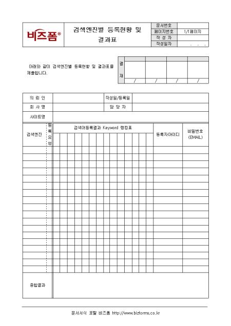 검색엔진별 등록현황 및 결과를 기록/ 관리할 수 있는 검색엔진별 등록현황표입니다. 의뢰인, 회사명, 사이트명, 검색엔진, 등록자아이디 등의 항목으로 구성되어있으며 하단에 종합결과 내용을 기록합니다.