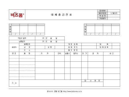 대체출금에 관한 내용을 기록하는 대체출금전표입니다. 납품일자, 공급자, 품명, 규격, 단위 등의 항목으로 구성되어있으며 경리담당자가 작성합니다.