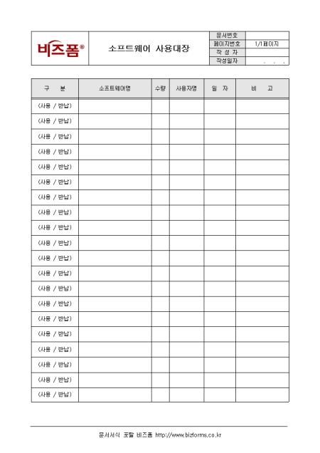 소프트웨서 사용 기록을 작성/ 보고하는 소프트웨어 사용대장입니다. 구분, 소프트웨어명, 수량, 사용자명, 일자 등의 항목으로 구성되어있으며, 소프트웨어 관리자가 직접 작성합니다.