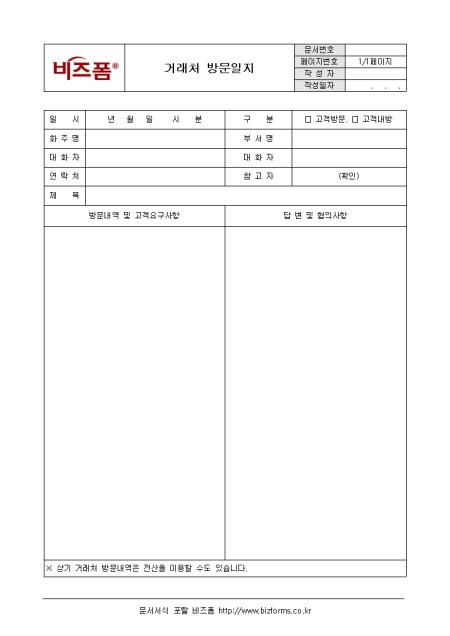 거래처 방문시 관련 기록을 정리 할 수 있는 거래처 방문일지 양식입니다. 일시, 대화자, 참고자, 방문내역 및 고객요구사항 등의 항목으로 구성되어 있습니다.