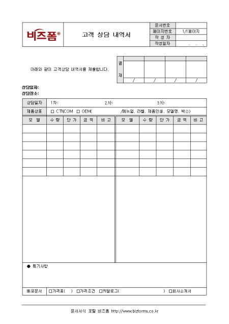 제품에 대한 고객불만 상담시 상담내용을 기록하는 고객상담내역서 양식입니다. 상담일자, 상담장소, 모델, 수량 등의 항목으로 구성되어 있습니다.