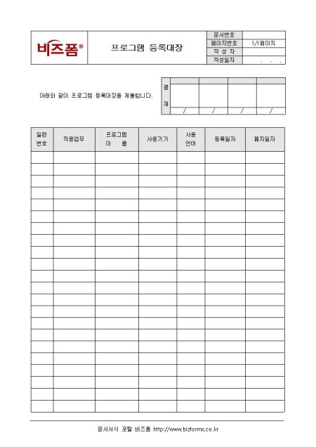 프로그램의 등록 및 폐기에 관한 사항을 기록/ 관리하는 프로그램 등록대장입니다. 일련번호, 적용업무, 프로그램 이름, 사용기기 등의 항목으로 구성되어있으며 관리자가 작성합니다.