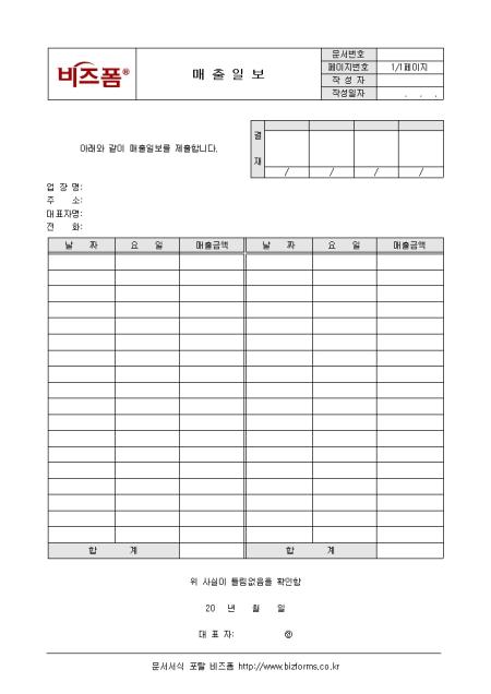 날짜와 요일별로 매출금액을 기록하여 월말에 합계를 산출할 수 있는 매출일보 양식입니다. 업장명, 주소, 날짜, 요일, 매출금액 등의 항목으로 구성되어 있습니다.