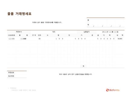 주문한 물품의 거래내역을 확인할 수 있는 물품거래명세표 양식으로, CODE번호, 품명, 규격, 단위 등의 항목으로 구성되어 있습니다.