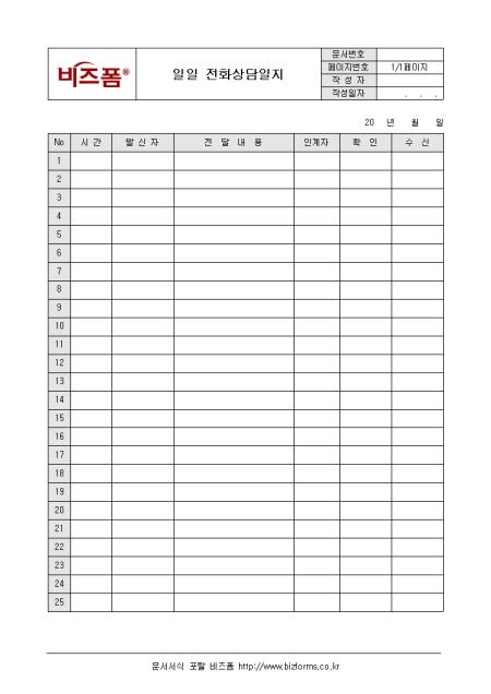 간단하게 당일 전화상담 내용을 정리할수 있는 일일전화상담일지 양식입니다.시간, 발신자, 전달내용, 인계자, 확인, 수신 등의 항목으로 구성되어 있습니다.