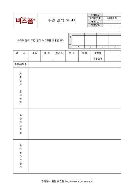 주별 업무계획에서 결과등을 보고하는 주간 실적 보고서 양식입니다. 업무명, 목표/실적률, 계획대비 결과분서 등의 항목으로 구성되어 있습니다.