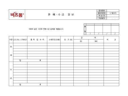당일 발생한 판매내용과 수금상황을 거래선 별로 기록하는 판매 수금 일보 양식입니다. L/G No. (거래선), 품목 및 규격, 수량 등의 항목으로 구성되어 있습니다.
