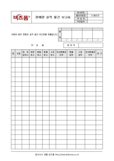 판매원에 따른 판매실적을 관리할 수 있는 판매원 실적 월간보고표 양식으로 접포접객수, 방문횟수, 배달횟수, 매출횟수 등의 항목으로 구성되어 있습니다.