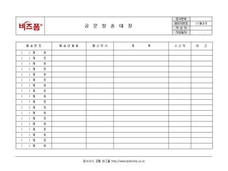 공문발송 내역을 정리하는 공문발송대장 양식입니다. 발송번호, 발송년월일, 발신부서, 제목, 수신처 등의 항목으로 구성되어 있습니다.