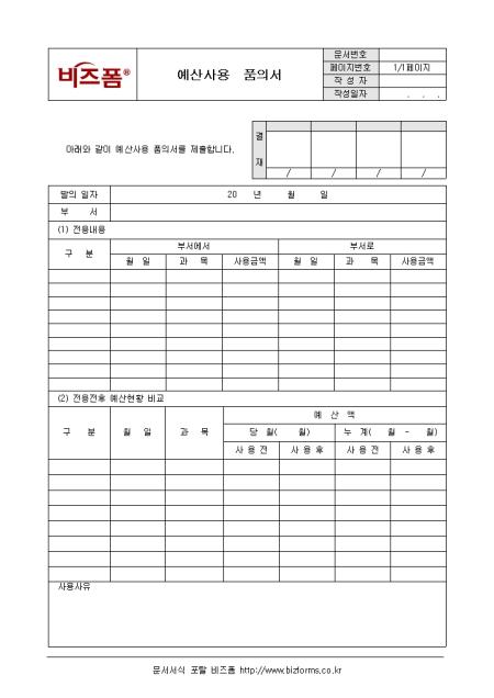 예산사용 품의서 양식으로, 발의 일자, 부서 등의 항목과 전용내용, 전용전후 예산현황 비교할 수 있는 항목으로 구성되어 있습니다.