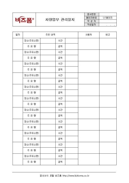 차량 주유내역 및 사용처등을 기입하여 차량업무 관리를 할 수 있는 차량업무 관리 일지 양식입니다.
