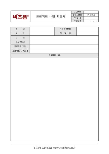프로젝트 수행에 관한 전반적인 사항을 기록/ 관리할 수 있는 프로젝트 수행 확인서입니다. 성명, 상호, 주소, 프로젝트명, 프로젝트기간 등의 항목으로 구성되어있습니다.
