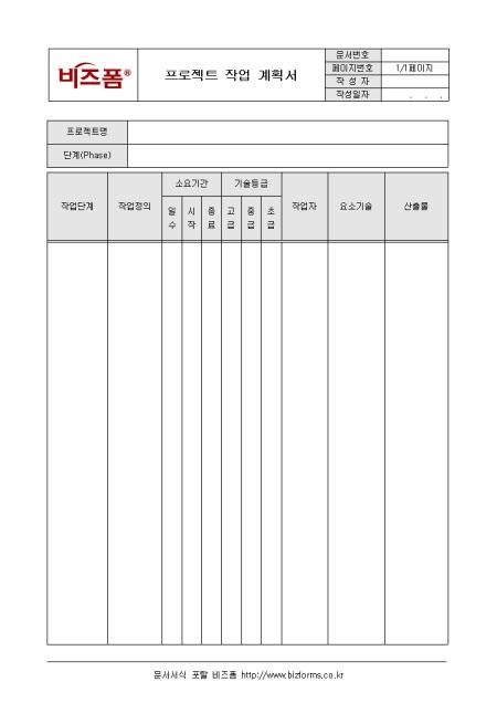 진행 프로젝트에 대해 작업 계획 수립 시 사용할 수 있는 프로젝트 작업 계획서입니다. 프로젝트명, 단계, 작업단계, 작업정의 등의 항목으로 구성되어있습니다.