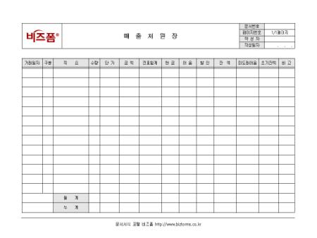 거래일자별로 매출에 관한 사항을 기록/ 관리할 수 있는 매출처원장입니다. 거래일자, 구분, 적요, 수량, 단가, 금액, 전표합계 등의 항목으로 구성되어있습니다.