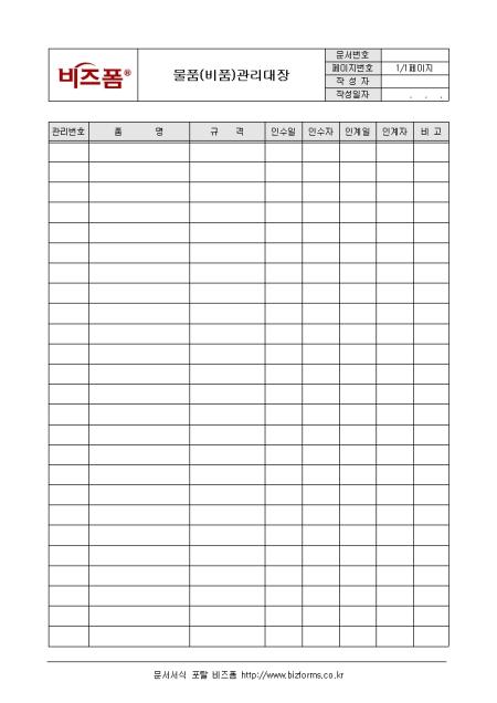 물품 및 비품의 현황을 기록하고 관리하는 물품(비품)관리대장입니다. 관리번호, 품명, 규격, 인수일 등의 항목으로 구성되어있습니다.